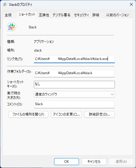 そもそも一つ上のフォルダ(C:\Users\<ユーザー名>\AppData\Local\slack\)にslack.exe本体と、app.icoというファイルがあるし、このフォルダを指定してあげれば良さそう。(問題がないデスクトップ上のショートカットはここを指している)