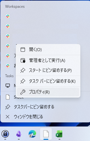タスクバーのアイコンのプロパティを見てみる。(白紙アイコンを右クリック> プロパティ)